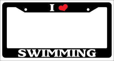 Black License Plate Frame "I Heart Swimming" Auto Accessory Novelty I Heart Swimming Black license plate frame made from high impact ABS plastic, covered with color vinyl printing. This frame is designed to last. These frames will last longer than your car.