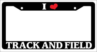 Black License Plate Frame "I Heart Track and Field" Auto Accessory Novelty I Heart Track and Field Black license plate frame made from high impact ABS plastic, covered with color vinyl printing. This frame is designed to last. These frames will last longer than your car.