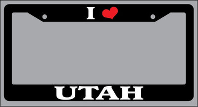 Black License Plate Frame "I Heart Utah" Auto Accessory Novelty I Heart Utah Black license plate frame made from high impact ABS plastic, covered with color vinyl printing. This frame is designed to last. These frames will last longer than your car.