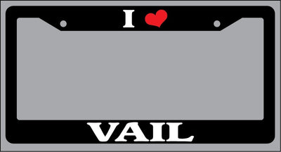 Black License Plate Frame "I Heart Vail" Auto Accessory Novelty I Heart Vail Black license plate frame made from high impact ABS plastic, covered with color vinyl printing. This frame is designed to last. These frames will last longer than your car.