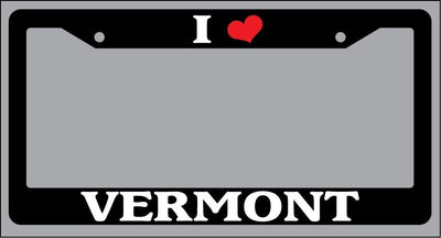 Black License Plate Frame "I Heart Vermont" Auto Accessory Novelty I Heart Vermont Black license plate frame made from high impact ABS plastic, covered with color vinyl printing. This frame is designed to last. These frames will last longer than your car.