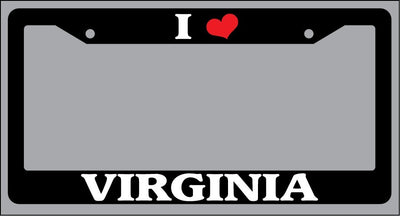 Black License Plate Frame "I Heart Virginia" Auto Accessory Novelty I Heart Virginia Black license plate frame made from high impact ABS plastic, covered with color vinyl printing. This frame is designed to last. These frames will last longer than your car.