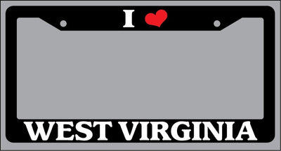 Black License Plate Frame "I Heart West Virginia" Auto Accessory Novelty I Heart West Virginia Black license plate frame made from high impact ABS plastic, covered with color vinyl printing. This frame is designed to last. These frames will last longer than your car.