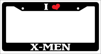 Black License Plate Frame "I Heart X-Men" Auto Accessory Novelty I Heart X-Men Black license plate frame made from high impact ABS plastic, covered with color vinyl printing. This frame is designed to last. These frames will last longer than your car.