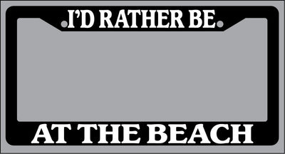 Black License Plate Frame "I'd rather be at the beach" Auto Accessory Novelty Black license plate frame made from high impact ABS plastic, covered with color vinyl printing. This frame is designed to last. These frames will last longer than your car.