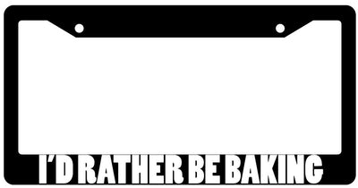 Black License Plate Frame "I'D Rather Be Baking" Auto Accessory Novelty Gifts " I'D Rather Be Baking " Black l icense plate frame made from high impact platable ABS. Covered with color vinyl printing. This frame is designed to last. Steel chrome frames when they get scratched will rust and rot away. These frames will last longer than your car.