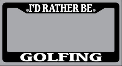Black License Plate Frame "I'd rather be golfing" Auto Accessory Novelty Black license plate frame made from high impact ABS plastic, covered with color vinyl printing. This frame is designed to last. These frames will last longer than your car.