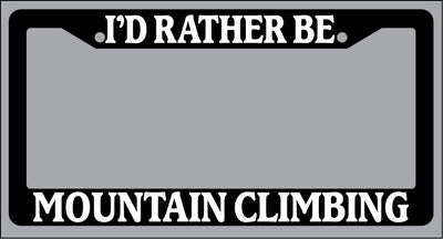 Black License Plate Frame "I'd rather be mountain climbing" Auto Accessory Black license plate frame made from high impact ABS plastic, covered with color vinyl printing. This frame is designed to last. These frames will last longer than your car.
