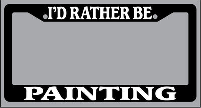 Black License Plate Frame "I'd rather be painting" Auto Accessory Novelty Black license plate frame made from high impact ABS plastic, covered with color vinyl printing. This frame is designed to last. These frames will last longer than your car.