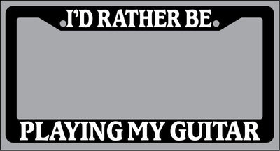 Black License Plate Frame "I'd rather be playing my guitar" Auto Accessory Black license plate frame made from high impact ABS plastic, covered with color vinyl printing. This frame is designed to last. These frames will last longer than your car.