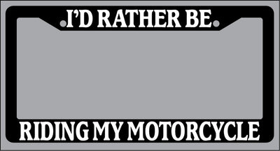 Black License Plate Frame "I'd rather be riding my motorcycle" Auto Accessory Black license plate frame made from high impact ABS plastic, covered with color vinyl printing. This frame is designed to last. These frames will last longer than your car.