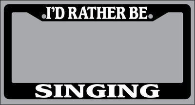 Black License Plate Frame "I'd rather be singing" Auto Accessory Novelty Black license plate frame made from high impact ABS plastic, covered with color vinyl printing. This frame is designed to last. These frames will last longer than your car.