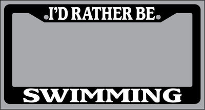 Black License Plate Frame "I'd rather be swimming" Auto Accessory Novelty Black license plate frame made from high impact ABS plastic, covered with color vinyl printing. This frame is designed to last. These frames will last longer than your car.