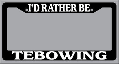 Black License Plate Frame "I'd rather be tebowing" Auto Accessory Novelty Black license plate frame made from high impact ABS plastic, covered with color vinyl printing. This frame is designed to last. These frames will last longer than your car.