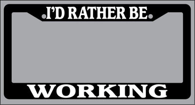 Black License Plate Frame "I'd Rather Be Working" Auto Accessory Novelty Black license plate frame made from high impact ABS plastic, covered with color vinyl printing. This frame is designed to last. These frames will last longer than your car.