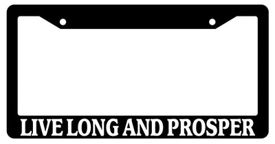 Black License Plate Frame "Live Long And Prosper" Auto Accessory Novelty Live Long And Prosper Black license plate frame made from high impact ABS plastic, covered with color vinyl printing. This frame is designed to last. These frames will last longer than your car.