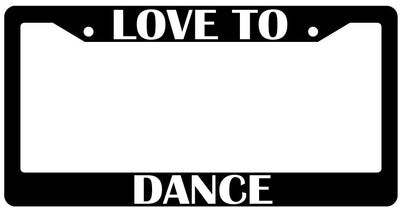 Black License Plate Frame "Love To Dance" Auto Accessory Novelty Gifts " Love To Dance " Black l icense plate frame made from high impact platable ABS. Covered with color vinyl printing. This frame is designed to last. Steel chrome frames when they get scratched will rust and rot away. These frames will last longer than your car.