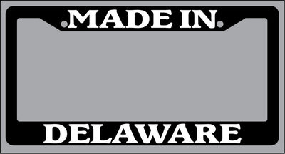 Black License Plate Frame "Made in Delaware" Auto Accessory Novelty Black license plate frame made from high impact ABS plastic, covered with color vinyl printing. This frame is designed to last. These frames will last longer than your car.