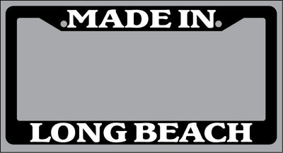 Black License Plate Frame "Made In Long Beach" Auto Accessory Novelty Made In Long Beach Black license plate frame made from high impact ABS plastic, covered with color vinyl printing. This frame is designed to last. These frames will last longer than your car.