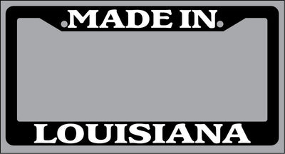 Black License Plate Frame "Made in Louisiana" Auto Accessory Novelty Black license plate frame made from high impact ABS plastic, covered with color vinyl printing. This frame is designed to last. These frames will last longer than your car.