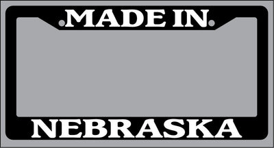 Black License Plate Frame "Made in Nebraska" Auto Accessory Novelty Black license plate frame made from high impact ABS plastic, covered with color vinyl printing. This frame is designed to last. These frames will last longer than your car.