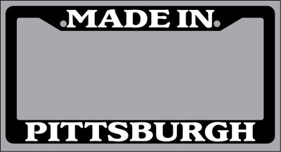 Black License Plate Frame "Made in Pittsburgh" Auto Accessory Novelty Black license plate frame made from high impact ABS plastic, covered with color vinyl printing. This frame is designed to last. These frames will last longer than your car.