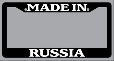 Black License Plate Frame "Made in Russia" Auto Accessory Novelty Black license plate frame made from high impact ABS plastic, covered with color vinyl printing. This frame is designed to last. These frames will last longer than your car.