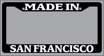 Black License Plate Frame "Made in San Francisco" Auto Accessory Novelty Black license plate frame made from high impact ABS plastic, covered with color vinyl printing. This frame is designed to last. These frames will last longer than your car.