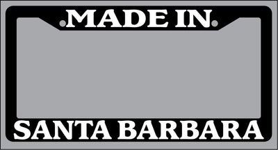 Black License Plate Frame "Made In Santa Barbara" Auto Accessory Novelty Made In Santa Barbara Black license plate frame made from high impact ABS plastic, covered with color vinyl printing. This frame is designed to last. These frames will last longer than your car.