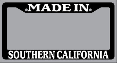 Black License Plate Frame "Made in Southern California" Auto Accessory Novelty Black license plate frame made from high impact ABS plastic, covered with color vinyl printing. This frame is designed to last. These frames will last longer than your car.