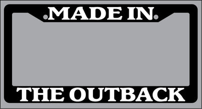 Black License Plate Frame "Made in The Outback" Auto Accessory Novelty Black license plate frame made from high impact ABS plastic, covered with color vinyl printing. This frame is designed to last. These frames will last longer than your car.