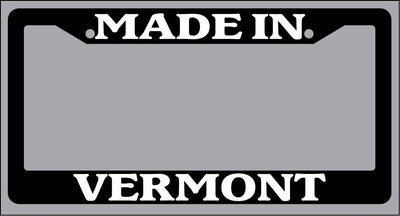 Black License Plate Frame "Made in Vermont" Auto Accessory Novelty Black license plate frame made from high impact ABS plastic, covered with color vinyl printing. This frame is designed to last. These frames will last longer than your car.