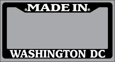 Black License Plate Frame "Made in Washington DC" Auto Accessory Novelty Black license plate frame made from high impact ABS plastic, covered with color vinyl printing. This frame is designed to last. These frames will last longer than your car.
