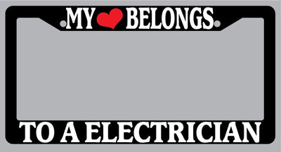 Black License Plate Frame "My Heart Belongs To A Electrician" Auto Accessory My Heart Belongs To A Electrician Black license plate frame made from high impact ABS plastic, covered with color vinyl printing. This frame is designed to last. These frames will last longer than your car.