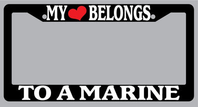 Black License Plate Frame "My Heart Belongs To A Marine" Auto Accessory Novelty My Heart Belongs To A Marine Black license plate frame made from high impact ABS plastic, covered with color vinyl printing. This frame is designed to last. These frames will last longer than your car.