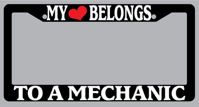 Black License Plate Frame "My Heart Belongs To A Mechanic" Auto Accessory My Heart Belongs To A Mechanic Black license plate frame made from high impact ABS plastic, covered with color vinyl printing. This frame is designed to last. These frames will last longer than your car.