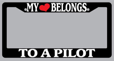 Black License Plate Frame "My Heart Belongs To A Pilot" Auto Accessory Novelty My Heart Belongs To A Pilot Black license plate frame made from high impact ABS plastic, covered with color vinyl printing. This frame is designed to last. These frames will last longer than your car.