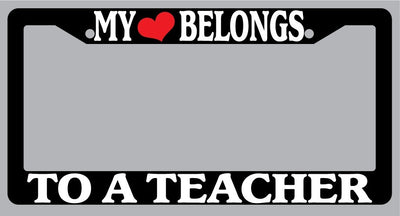 Black License Plate Frame "My Heart Belongs To A Teacher" Auto Accessory Novelty My Heart Belongs To A Teacher Black license plate frame made from high impact ABS plastic, covered with color vinyl printing. This frame is designed to last. These frames will last longer than your car.