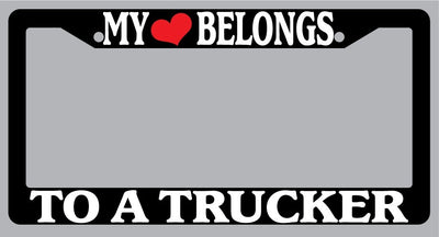 Black License Plate Frame "My Heart Belongs To A Trucker" Auto Accessory Novelty My Heart Belongs To A Trucker Black license plate frame made from high impact ABS plastic, covered with color vinyl printing. This frame is designed to last. These frames will last longer than your car.