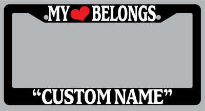 Black License Plate Frame "My Heart Belongs To "Custom Name" Auto Accessory My Heart Belongs To "Custom Name" Black license plate frame made from high impact ABS plastic, covered with color vinyl printing. Let Us know what you want your frame to say and we will put it on there. This frame is designed to last. These frames will last longer than your car.