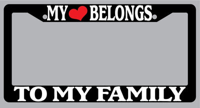 Black License Plate Frame "My Heart Belongs To My Family" Auto Accessory Novelty My Heart Belongs To My Family Black license plate frame made from high impact ABS plastic, covered with color vinyl printing. This frame is designed to last. These frames will last longer than your car.