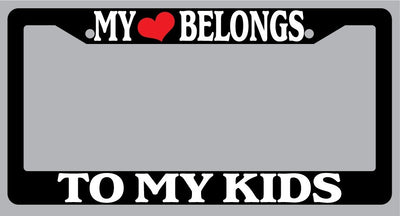 Black License Plate Frame "My Heart Belongs To My Kids" Auto Accessory Novelty My Heart Belongs To My Kids Black license plate frame made from high impact ABS plastic, covered with color vinyl printing. This frame is designed to last. These frames will last longer than your car.