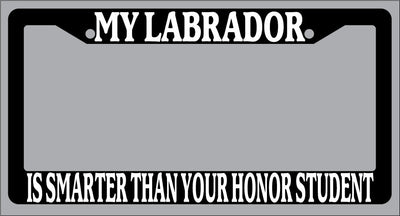 Black License Plate Frame "My Labrador Is Smarter Than Your Honor Student" Auto My Labrador Is Smarter Than Your Honor Student Black license plate frame made from high impact ABS plastic, covered with color vinyl printing. This frame is designed to last. These frames will last longer than your car.