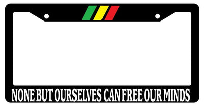 Black License Plate Frame "None But Ourselves Can Free Our Minds" Auto Access None But Ourselves Can Free Our Minds Black license plate frame made from high impact ABS plastic, covered with color vinyl printing. This frame is designed to last. These frames will last longer than your car.