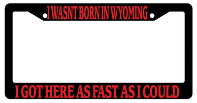 Black License Plate Frame "Not From Wyoming Got Here As Fast As I Could " Auto Not From Wyoming Got Here As Fast As I Could Black license plate frame made from high impact ABS plastic, covered with color vinyl printing. This frame is designed to last. These frames will last longer than your car.