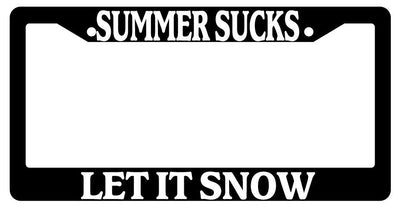 Black License Plate Frame "Summer Sucks Let it Snow" Auto Accessory Novelty Summer Sucks Let it Snow Black license plate frame made from high impact ABS plastic, covered with color vinyl printing. This frame is designed to last. These frames will last longer than your car.