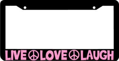 Black LIVE LOVE LAUGH License Plate Frame Plastic License Plate Frame Polystyrene plastic with vinyl graphics. Strong with tabs on the back to secure your plate to the frame. This is a buy it now for the frame pictured It is designed to fit a US/CANADA license plate.