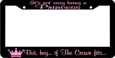 It's not easy being a PRINCESS But Hey, if the fits.... License Plate Frame Plastic License Plate Frame Polystyrene plastic with vinyl graphics. Strong with tabs on the back to secure your plate to the frame. This is a buy it now for the frame pictured It is designed to fit a US/CANADA license plate.