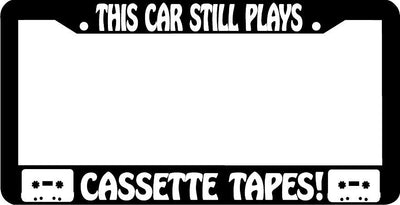 Cassette tapes this car still plays License Plate Frame Plastic License Plate Frame Polystyrene plastic with vinyl graphics. Strong with tabs on the back to secure your plate to the frame. This is a buy it now for the frame pictured It is designed to fit a US/CANADA license plate.