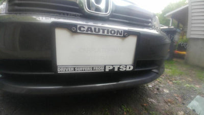 CAUTION DRIVER SUFFERS FROM P.T.S.D. POST TRAUMATIC STRESS License Plate Frame